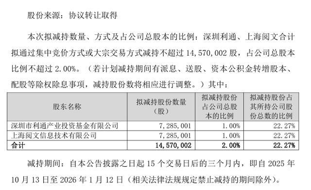 2025年9月12日,中文在线在深交所发布关于大股东股份减持计划预披露的公告。公告显示,腾讯系关联股东深圳市利通产业投资基金有限公司(以下简称“深圳利通”)、上海阅文信息技术有限公司(以下简称“上海阅文”)计划自本公告披露之日起15个交易日后的三个月内以集中竞价方式或大宗交易方式合计减持公司约1457.00万股,拟减持股份占公司总股本比例的2%。